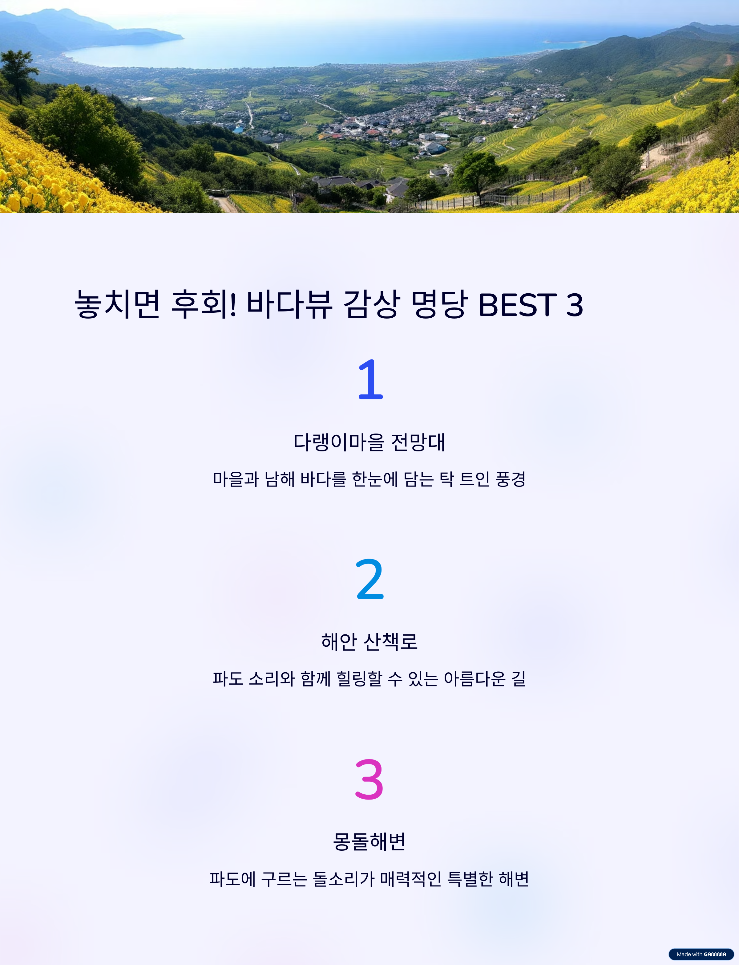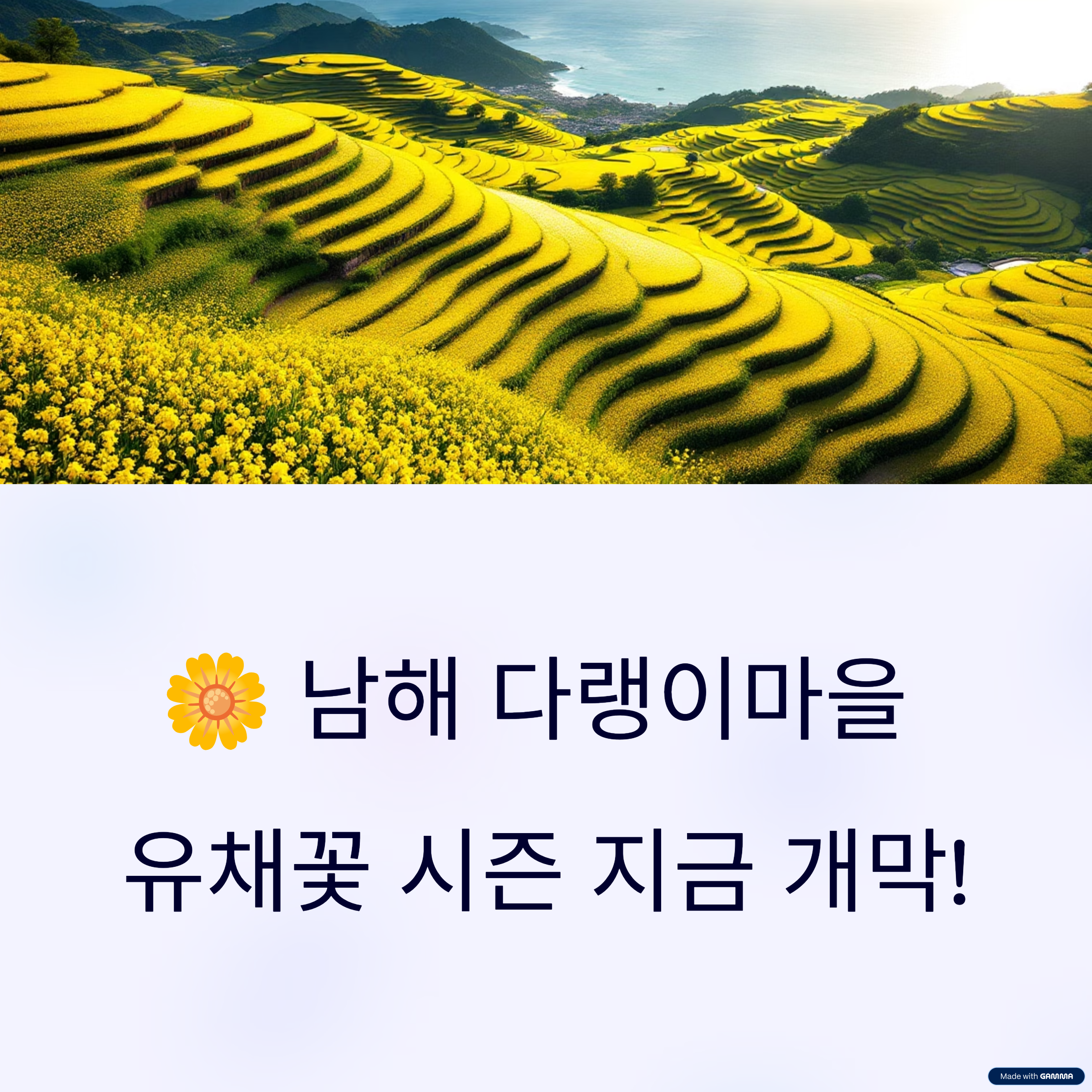남해 바다의 푸른 물결과 노란 유채꽃이 조화를 이루는 감동적인 풍경이 펼쳐져요.