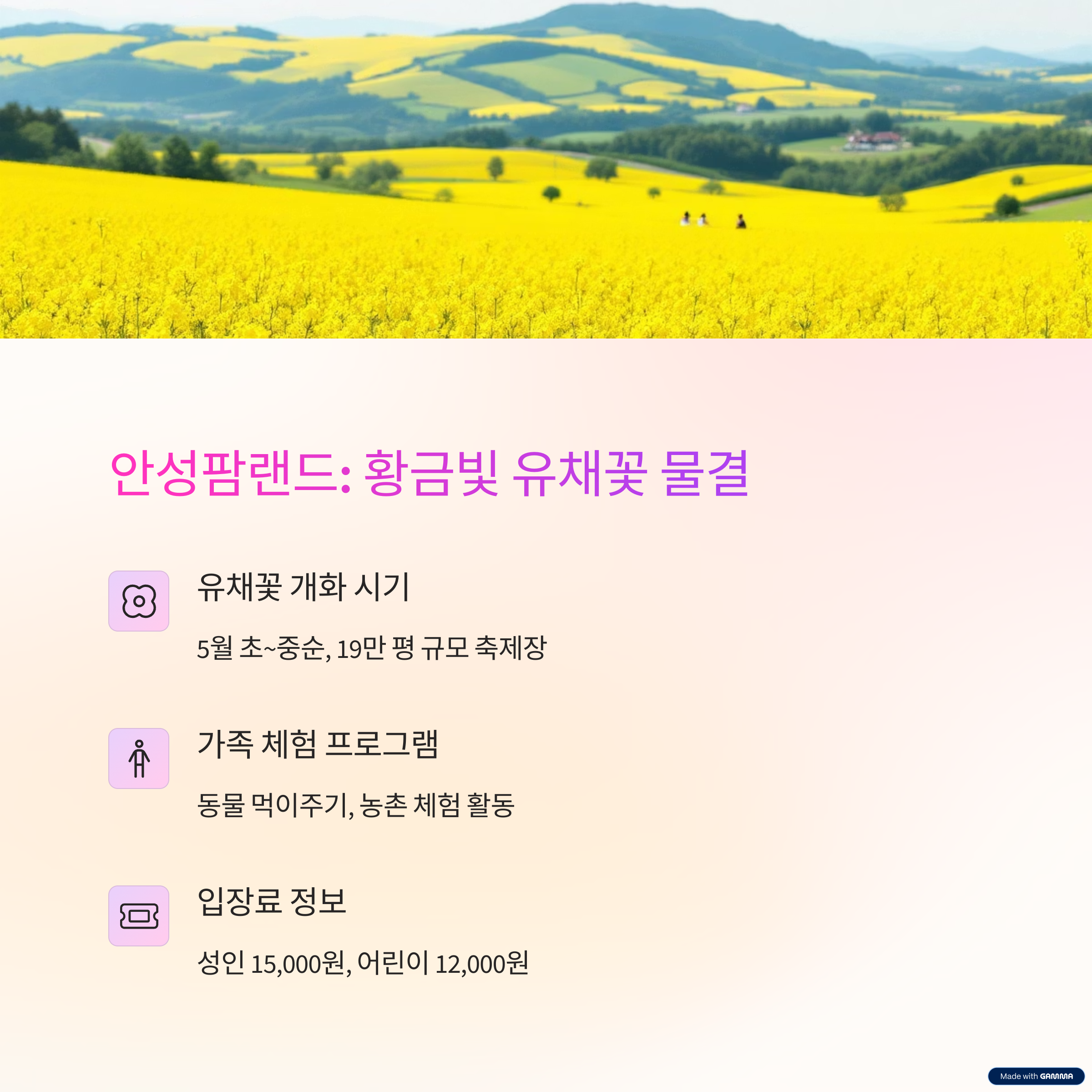 대규모 유채꽃밭과 동물체험이 결합된 테마파크형 여행지입니다.