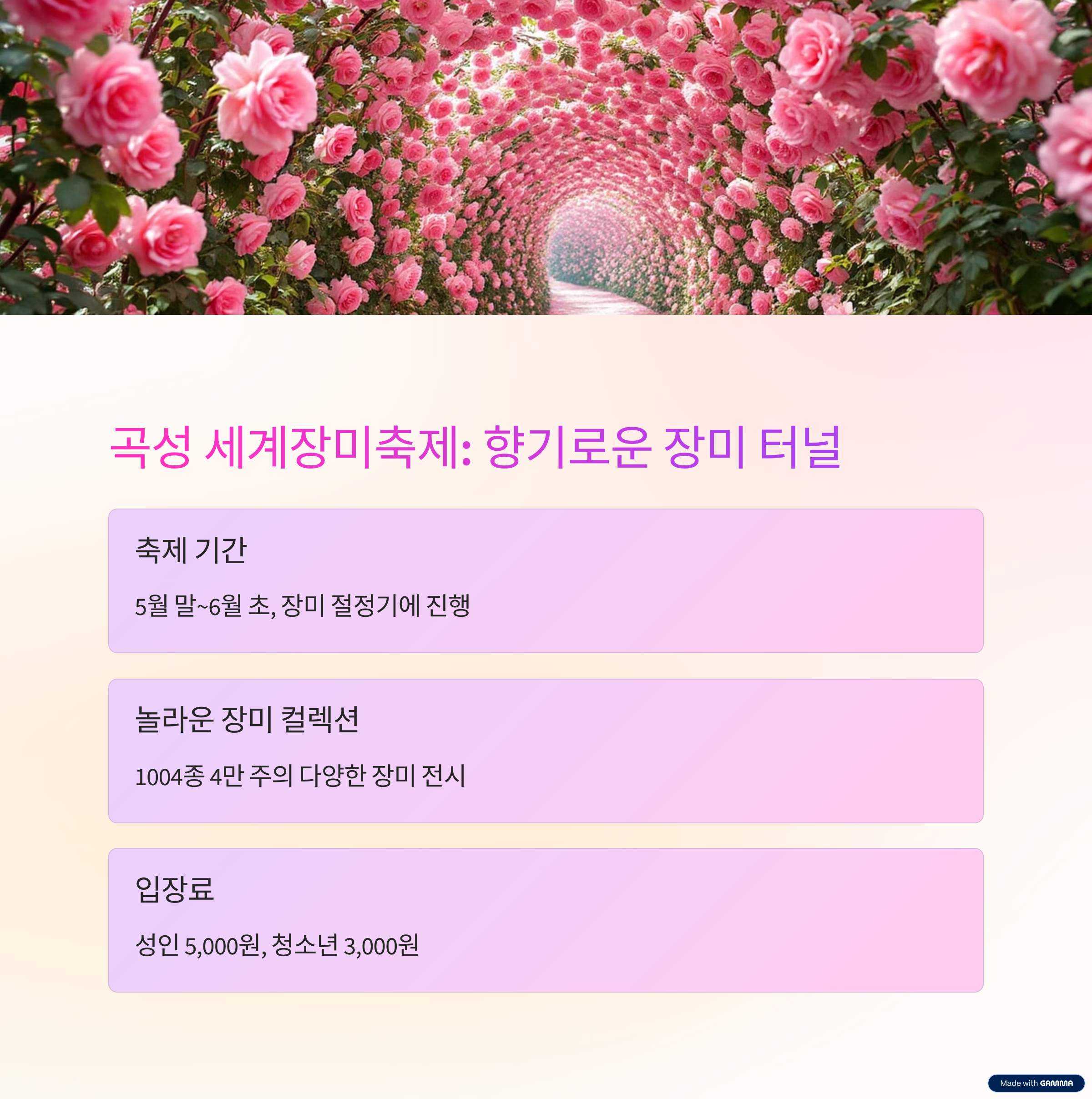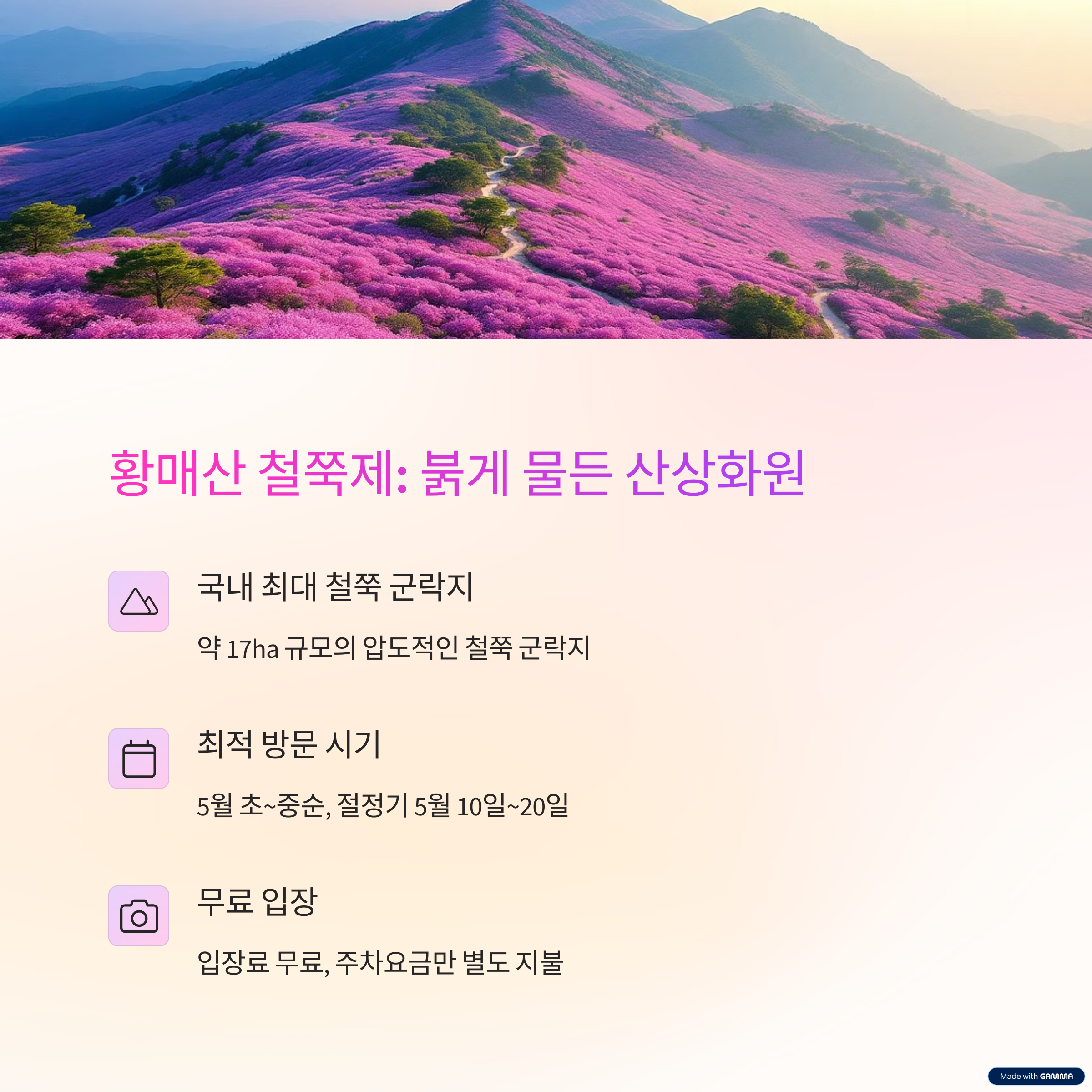 - 꽃 종류별 추천: 철쭉(황매산), 장미(곡성·서울), 유채꽃(안성), 튤립(태안), 녹차(보성)
