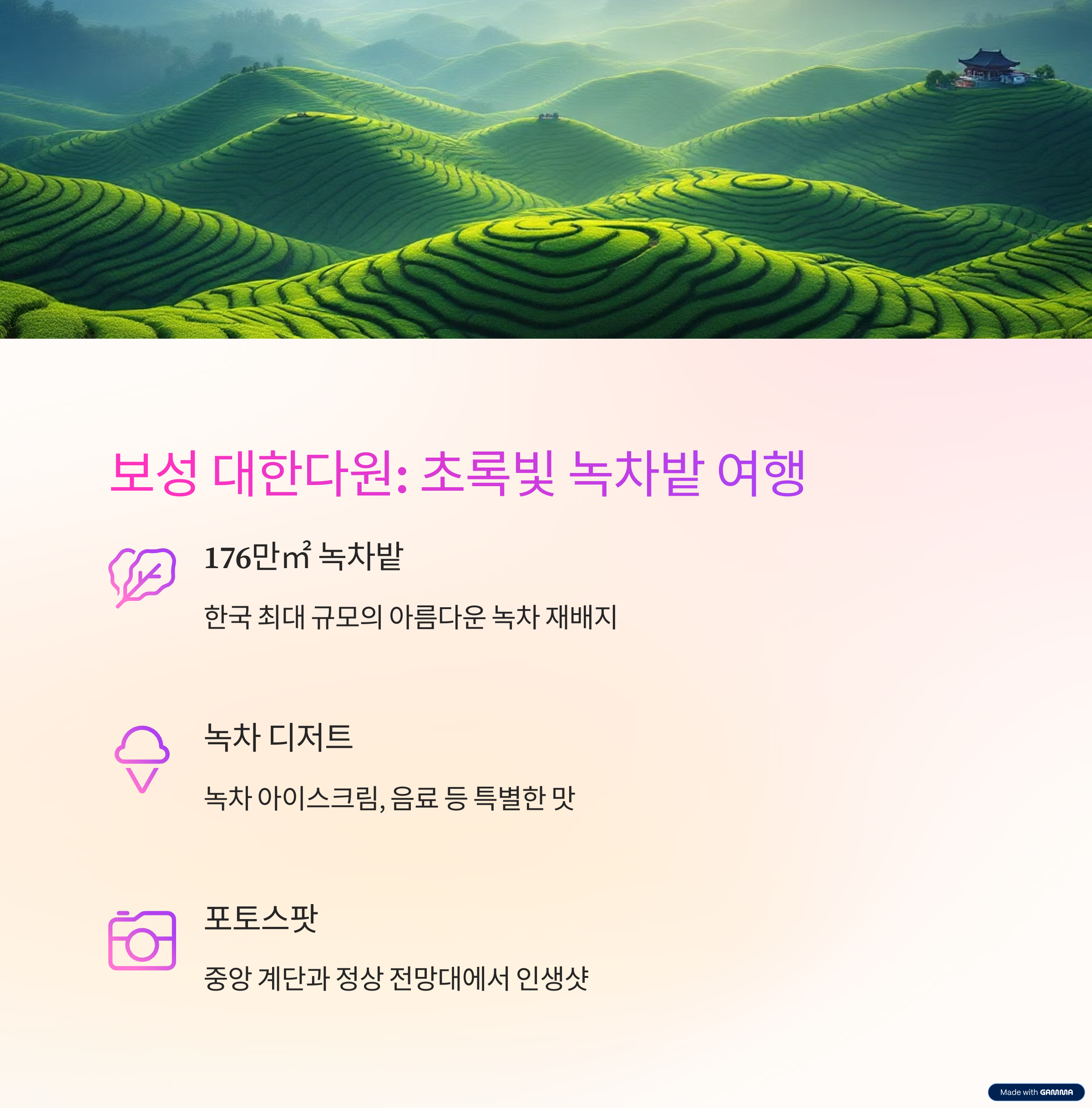 푸른 차밭과 함께 싱그러운 봄을 만끽할 수 있는 곳입니다.
