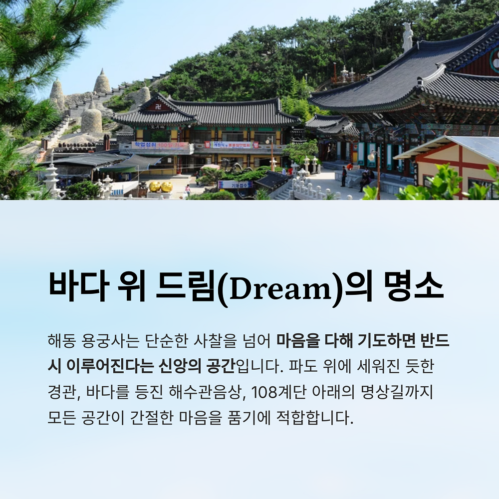 해동 용궁사는 단순한 사찰이 아닌 천혜의 자연이 감싸는 명상 공간입니다.