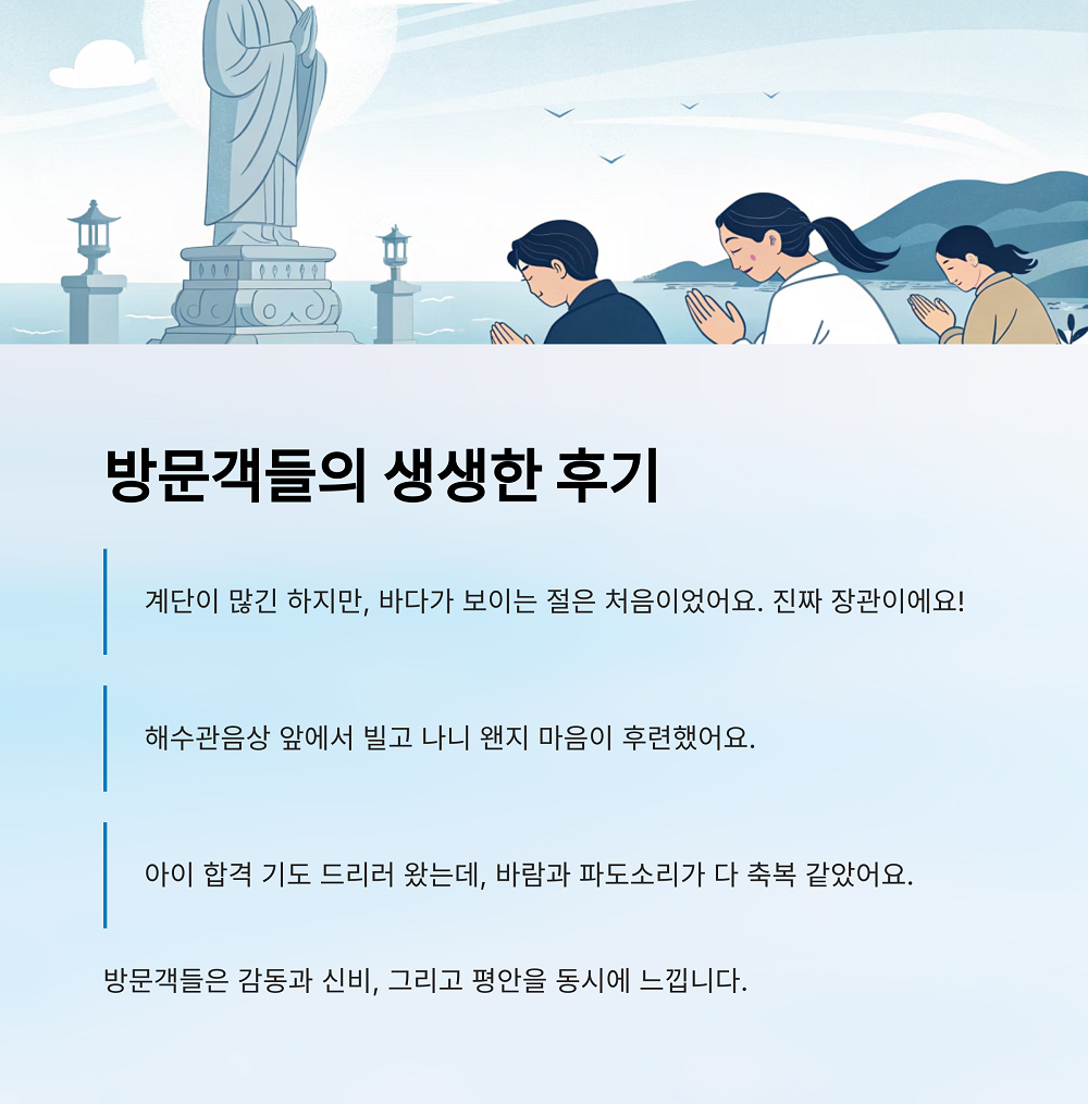 "계단이 많긴 하지만, 바다가 보이는 절은 처음이었어요. 진짜 장관이에요!"