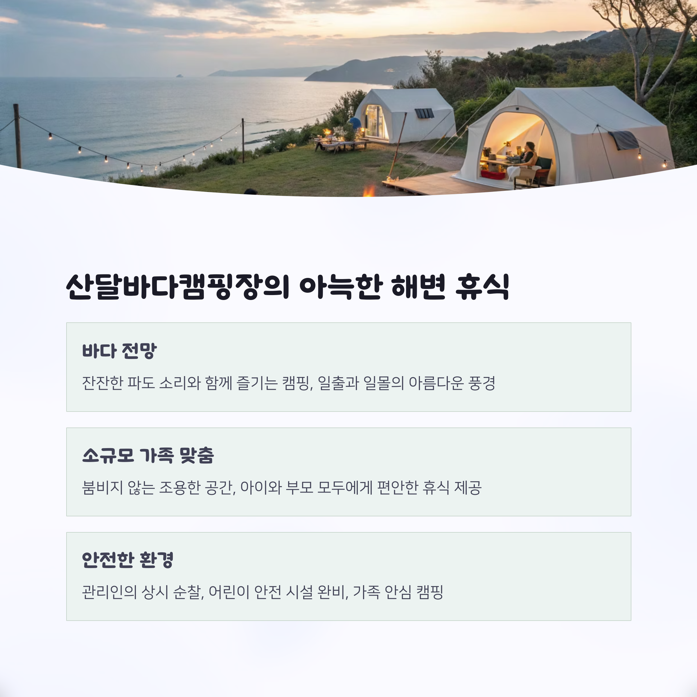 사이트 위치(놀이터 근접 여부), 위생 시설 유무, 주변 편의시설과 부모 이벤트 여부 등을 체크하면 만족스러운 캠핑 경험을 할 수 있습니다.