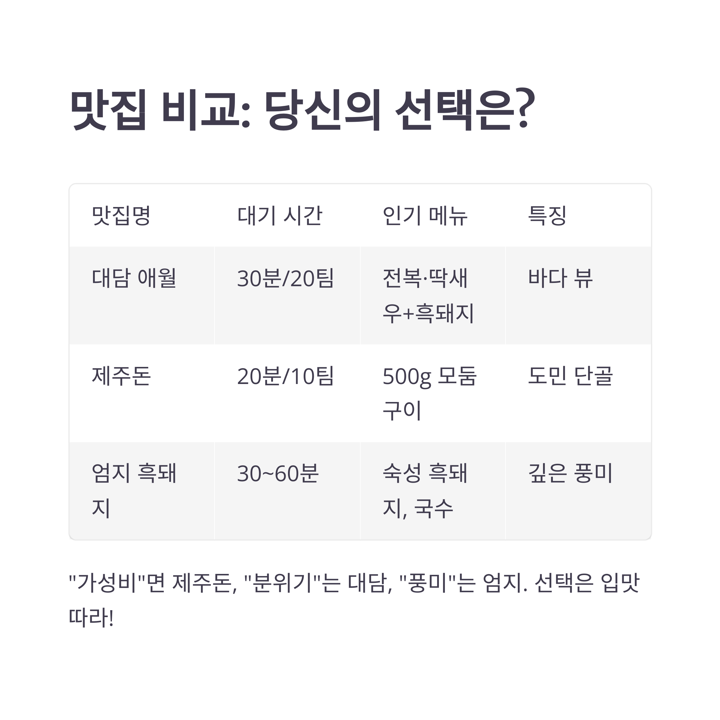 [비교표] 제주 애월 흑돼지 맛집 데이터 비교