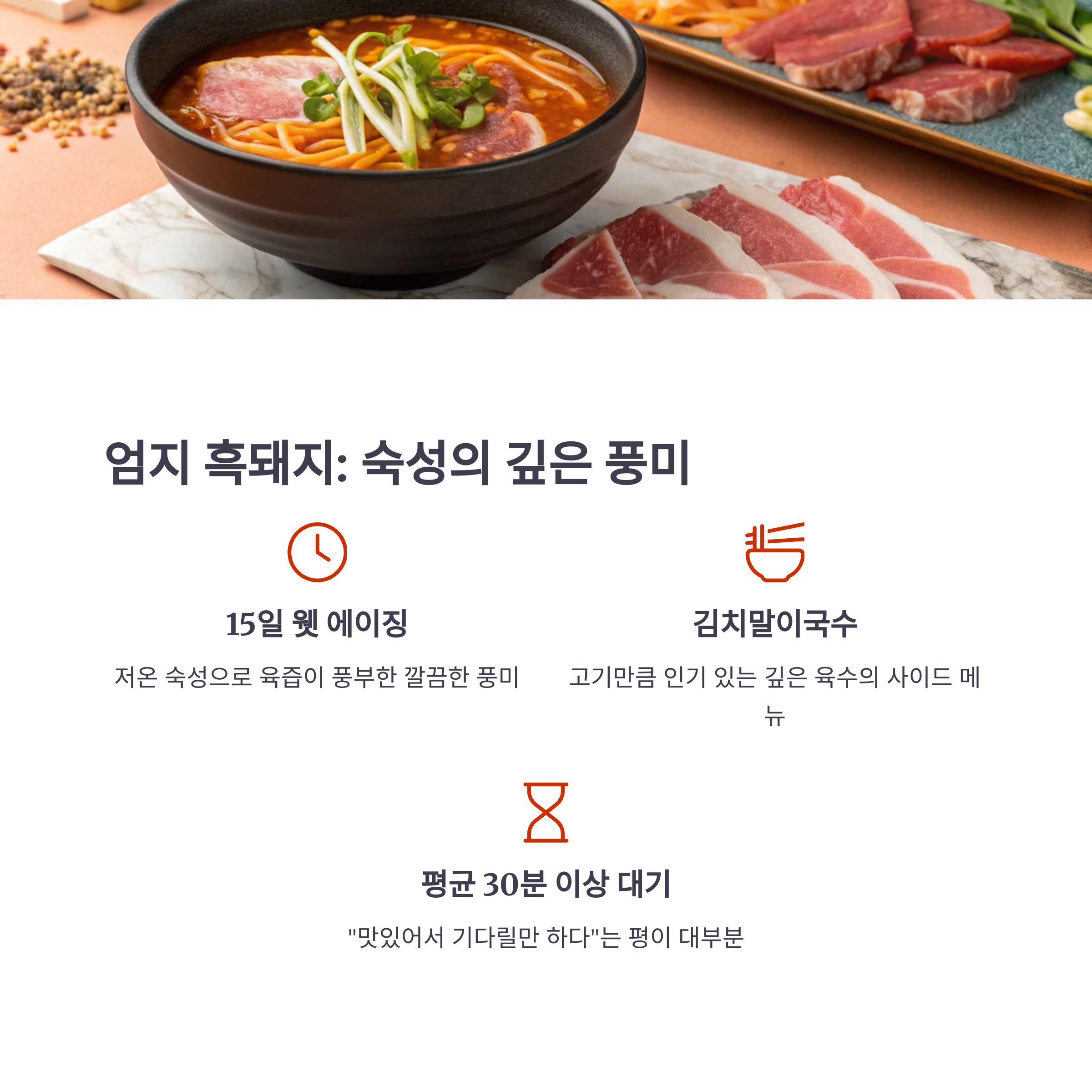 엄지 흑돼지 30~60분 / 15팀 1,200건 이상 180명 내외 숙성 흑돼지, 김치말이국수 웻 에이징, 깊은 풍미