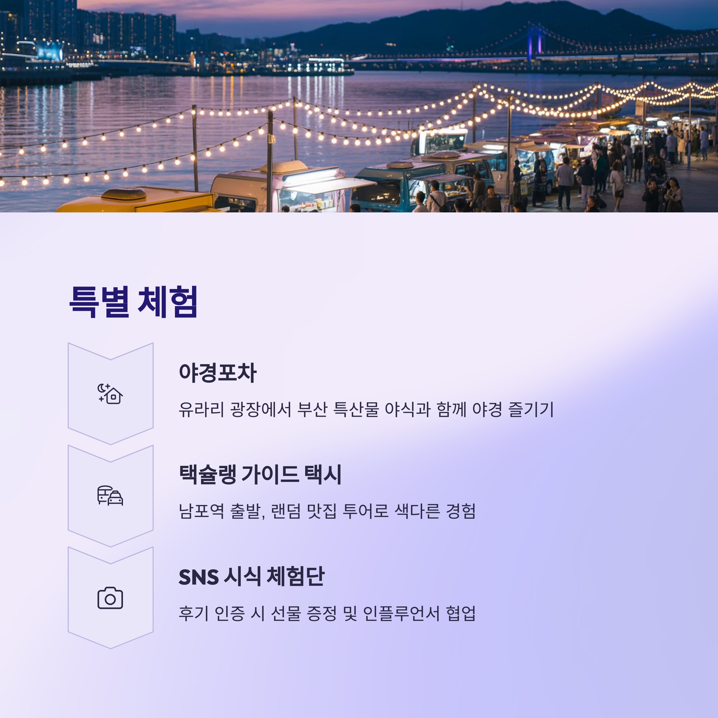 | 야경포차 | 상시 운영 유라리 광장 | 부산 특산물 야식과 함께 야경 즐기기, 자유 결제 |