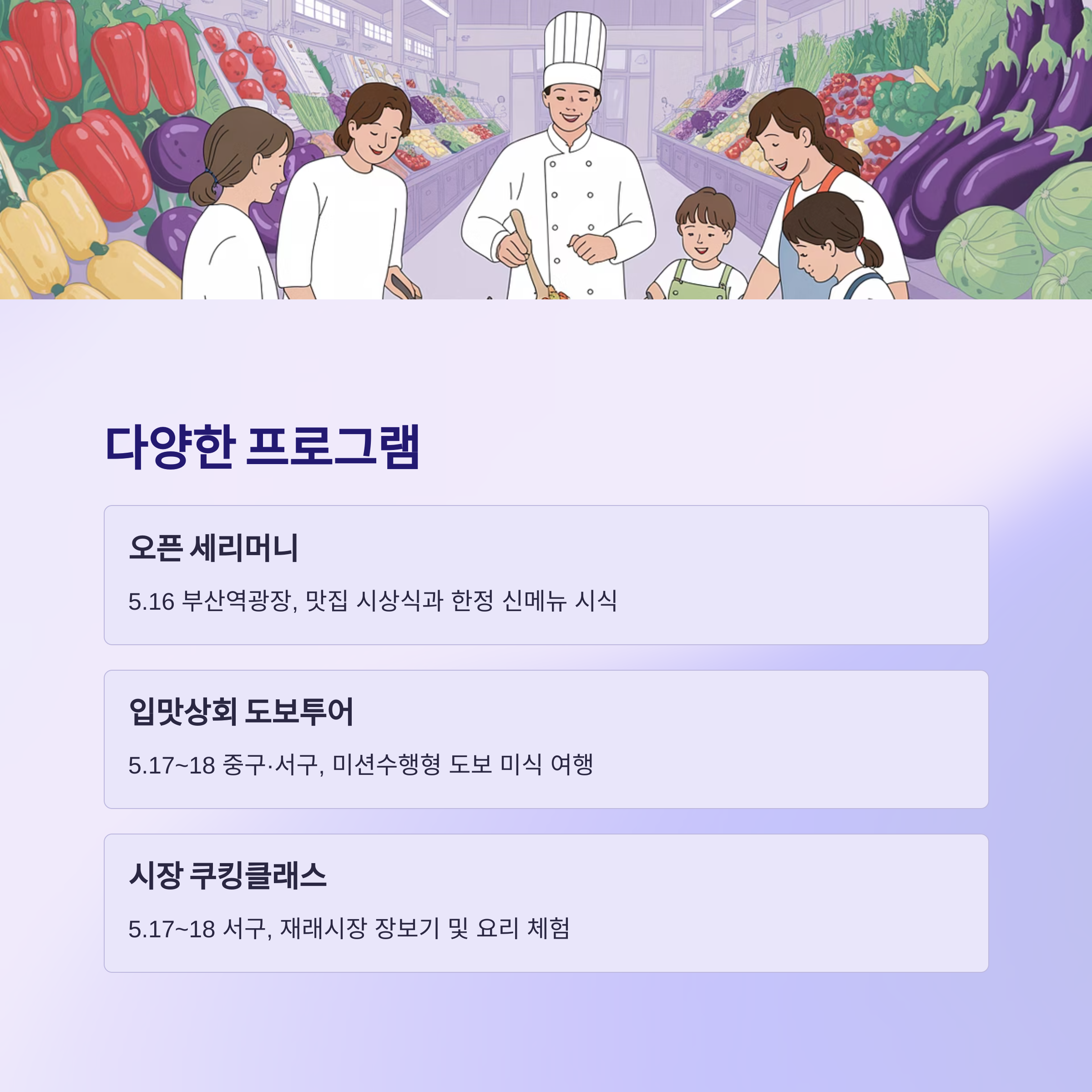 | 시장 쿠킹클래스 | 5.17~18 서구 | 재래시장 장보기 및 요리 체험, 팀 단위 진행 |