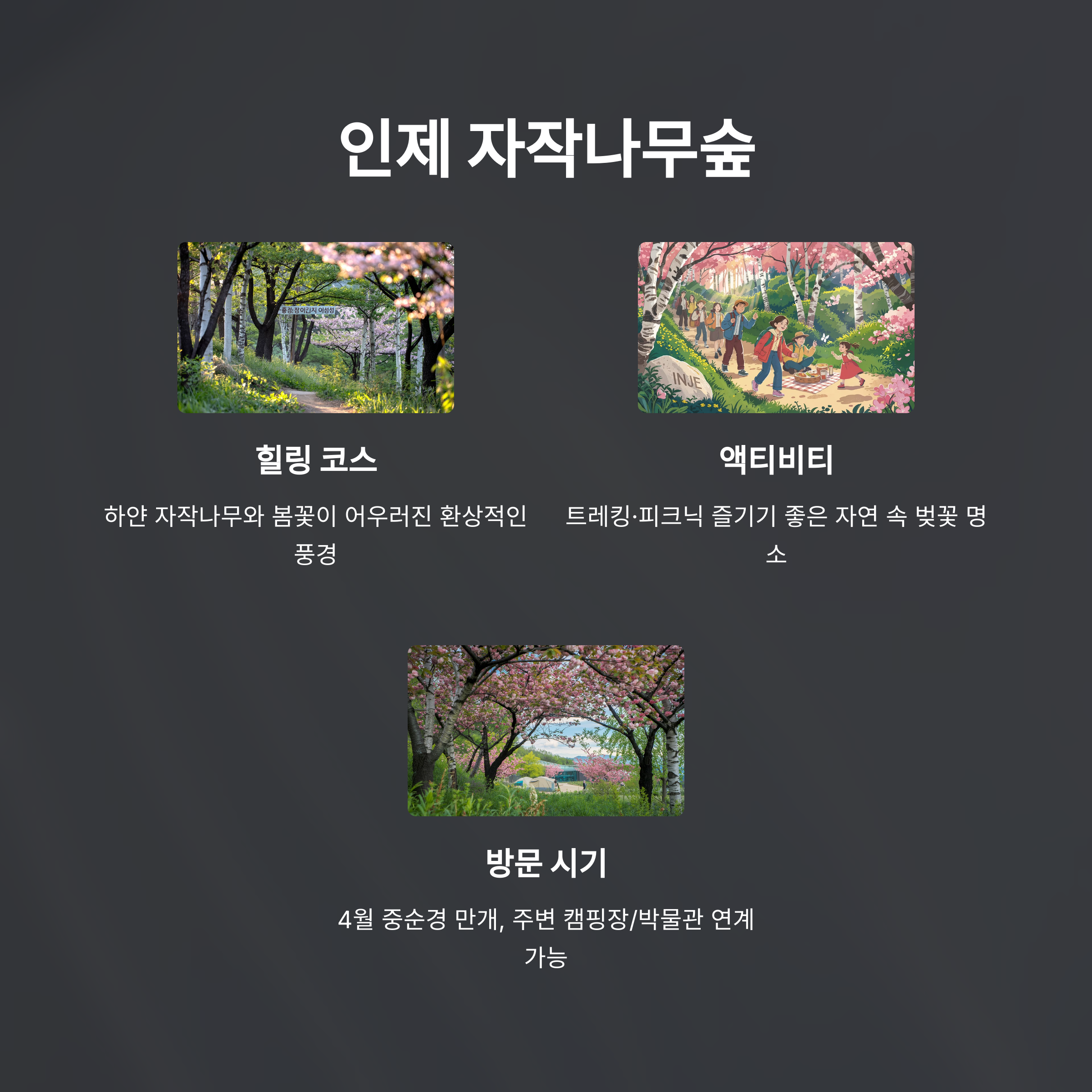 - 자작나무숲(인제): 피톤치드와 봄꽃이 어우러진 숲