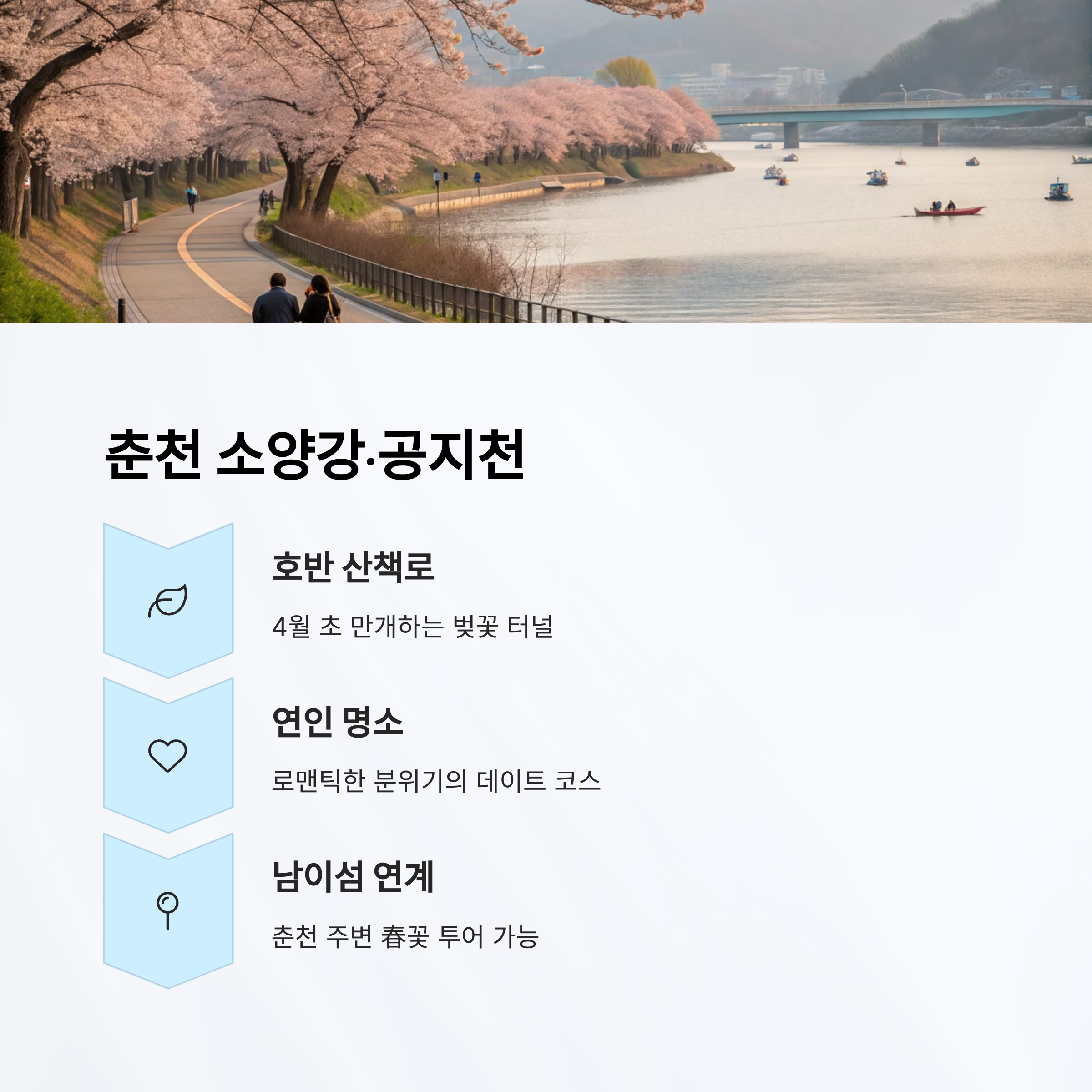 - 소양강 벚꽃길(춘천): 강 따라 펼쳐지는 5km 드라이브
