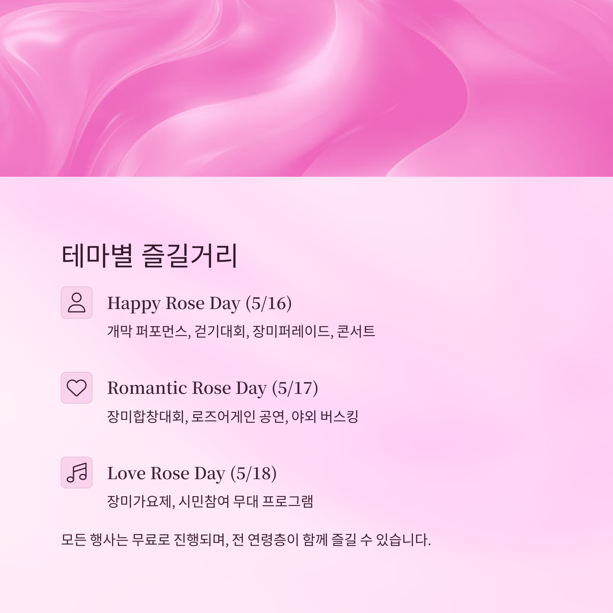| 5월 16일(금) | Happy Rose Day | 개막 퍼포먼스, 걷기대회(1.5km), 장미퍼레이드, 콘서트 |
