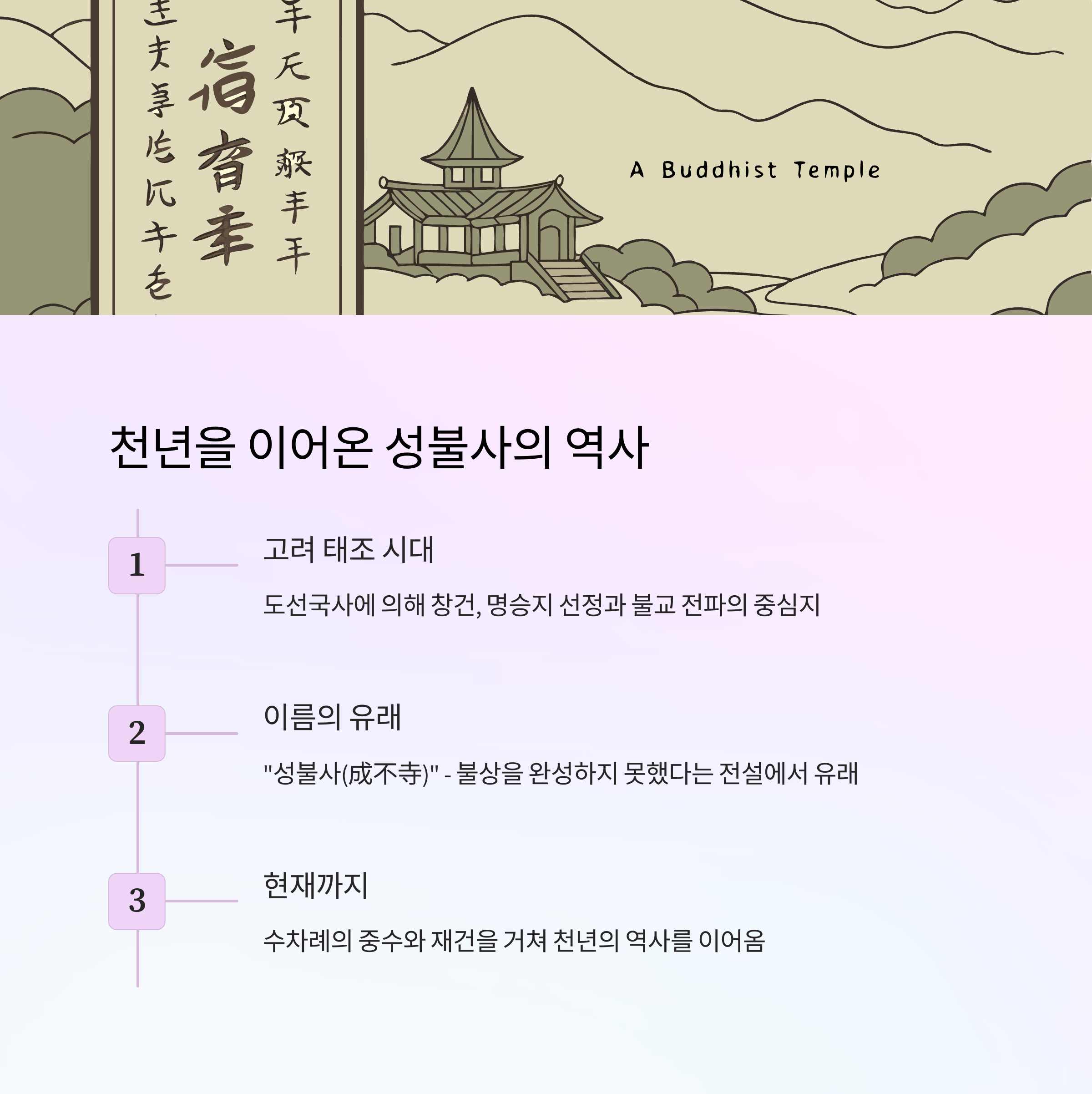 전국 주요 사찰들과 비교해도 성불사는 독특한 매력을 지니고 있습니다.