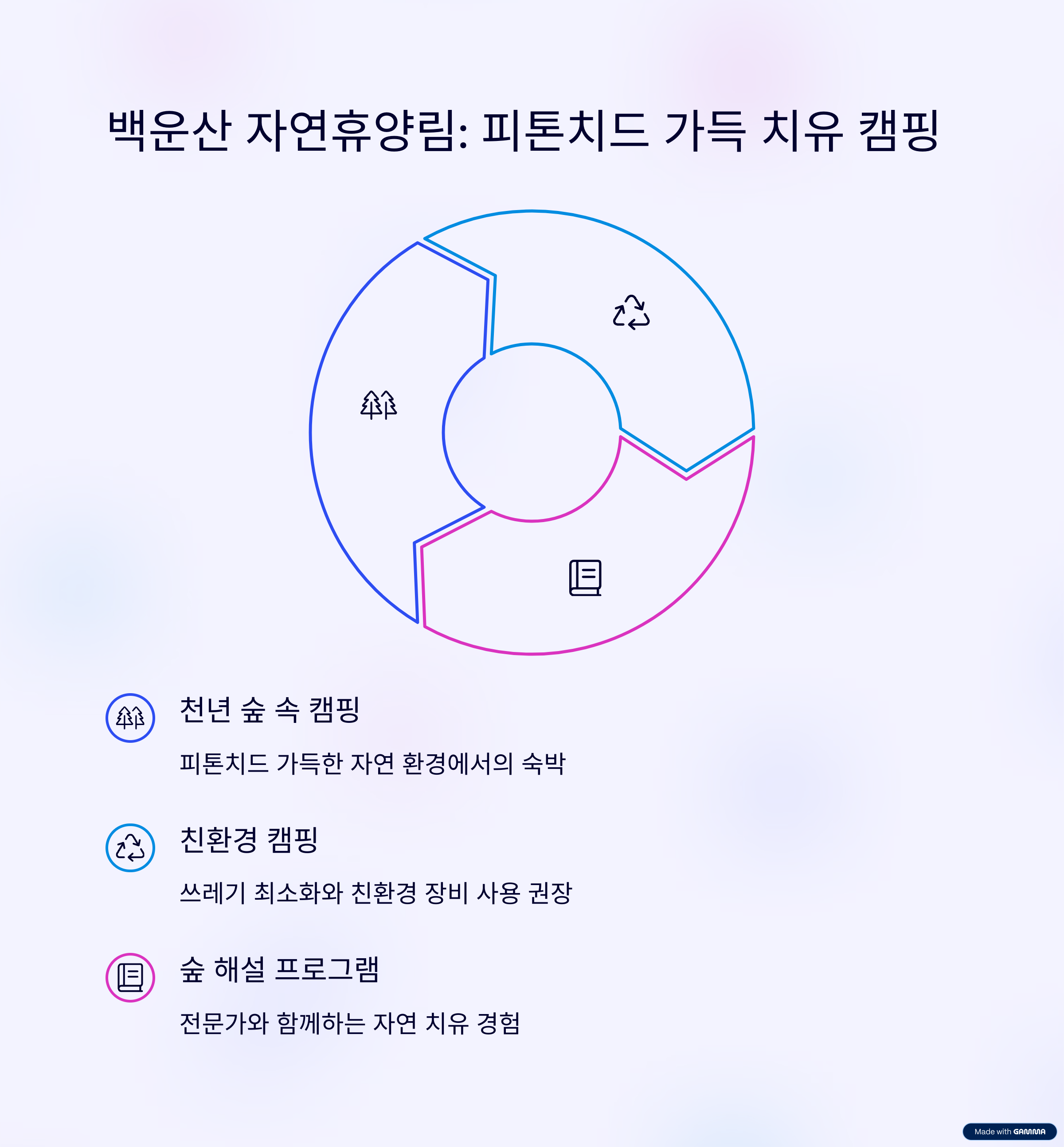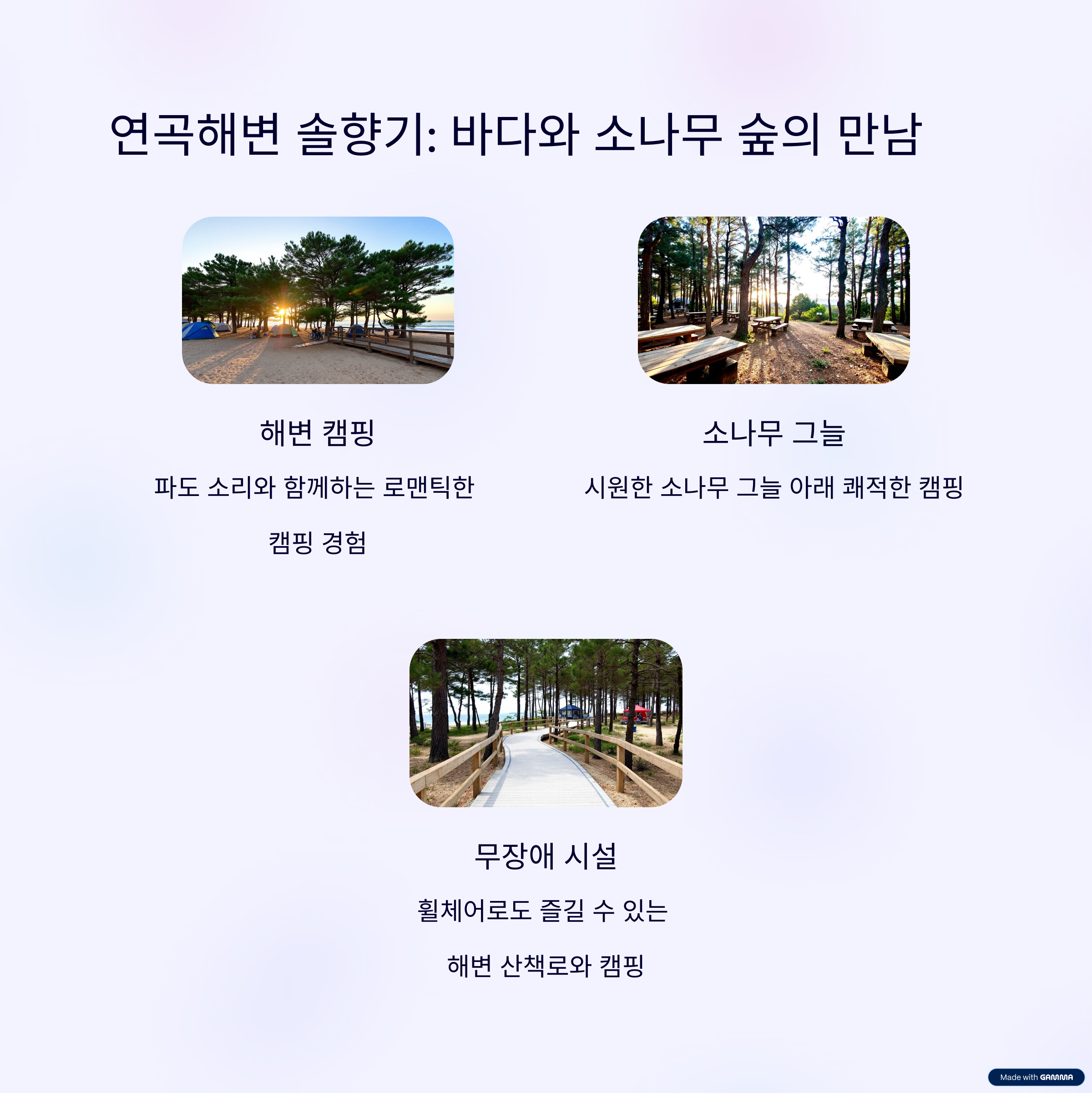 - 친환경/무장애 캠핑: 연곡해변, 태백산, 백운산