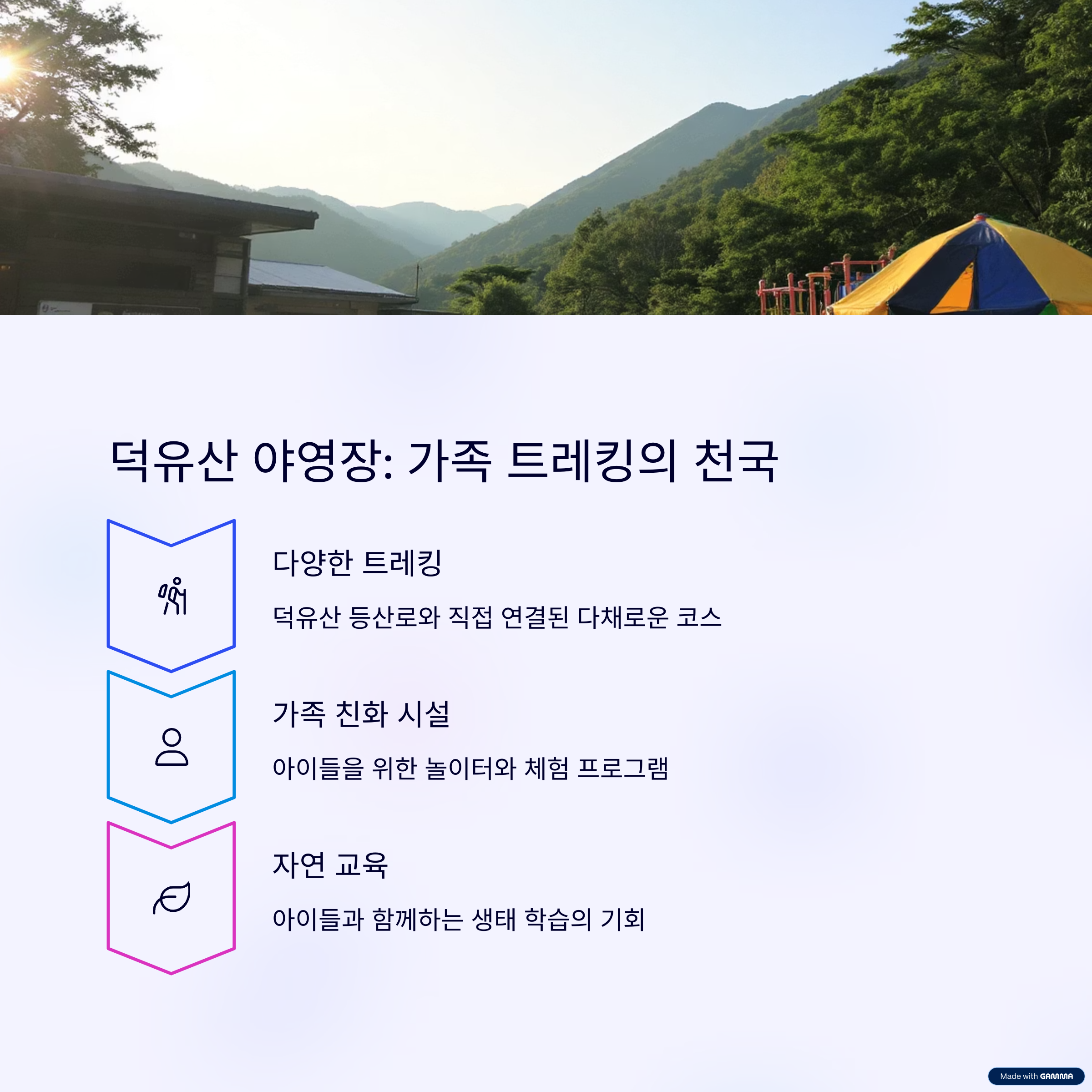 "쾌적한 숲 속에서 모든 가족이 함께하는 포용형 캠핑장!" 🌲