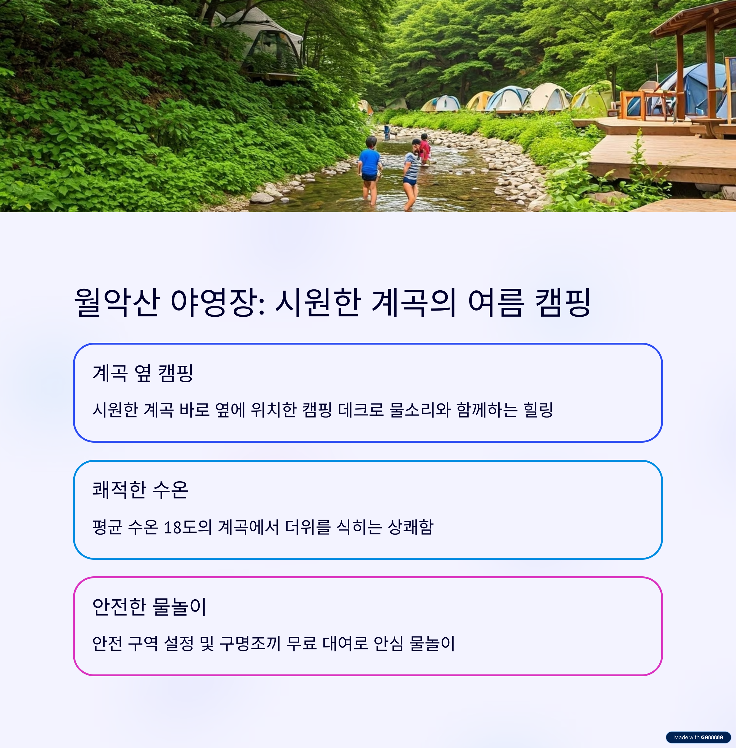 등산, 계곡 트레킹, 가족 캠핑 모두에 적합한 환경이에요.