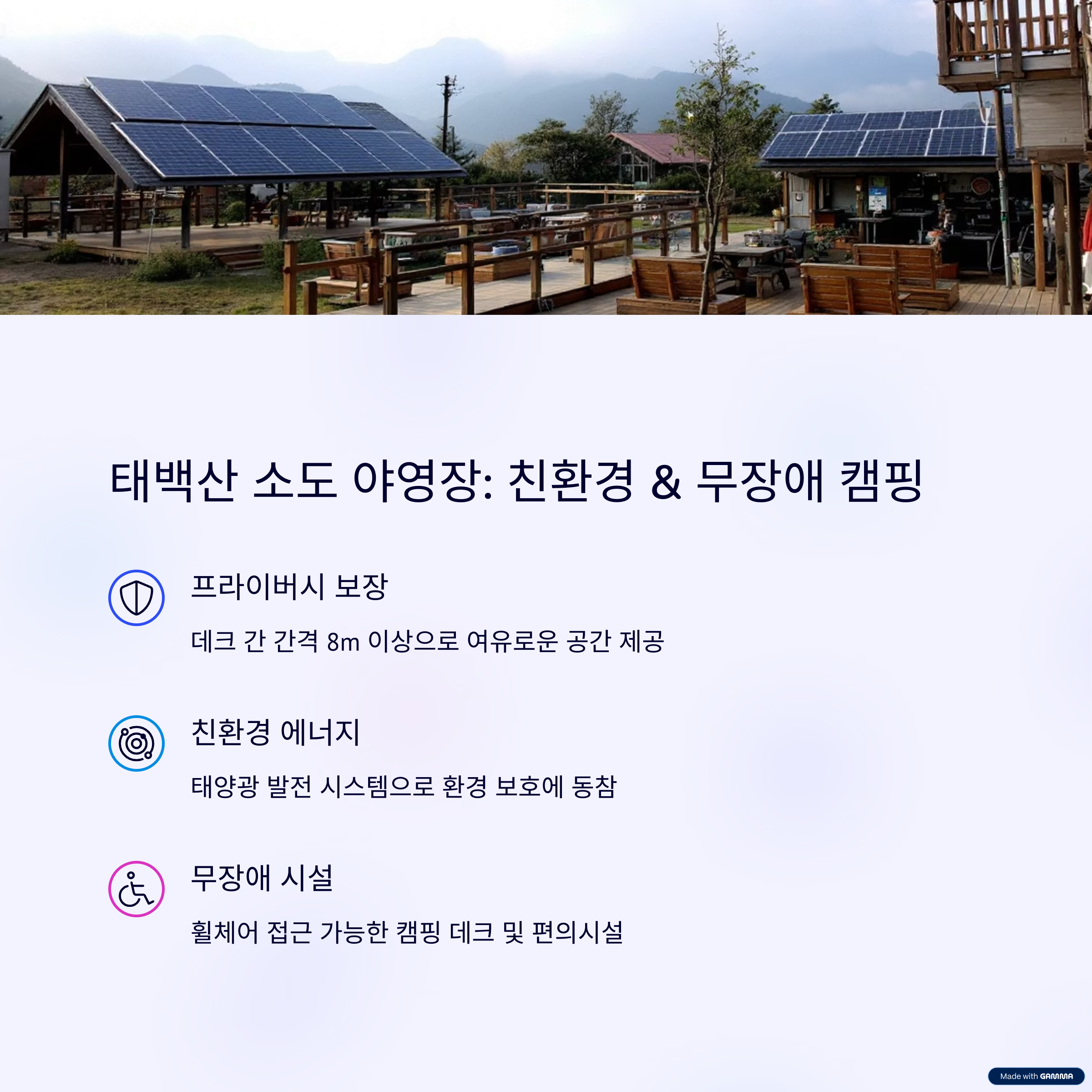 장애인 전용 데크, 카라반, 태양광 발전 설비 등