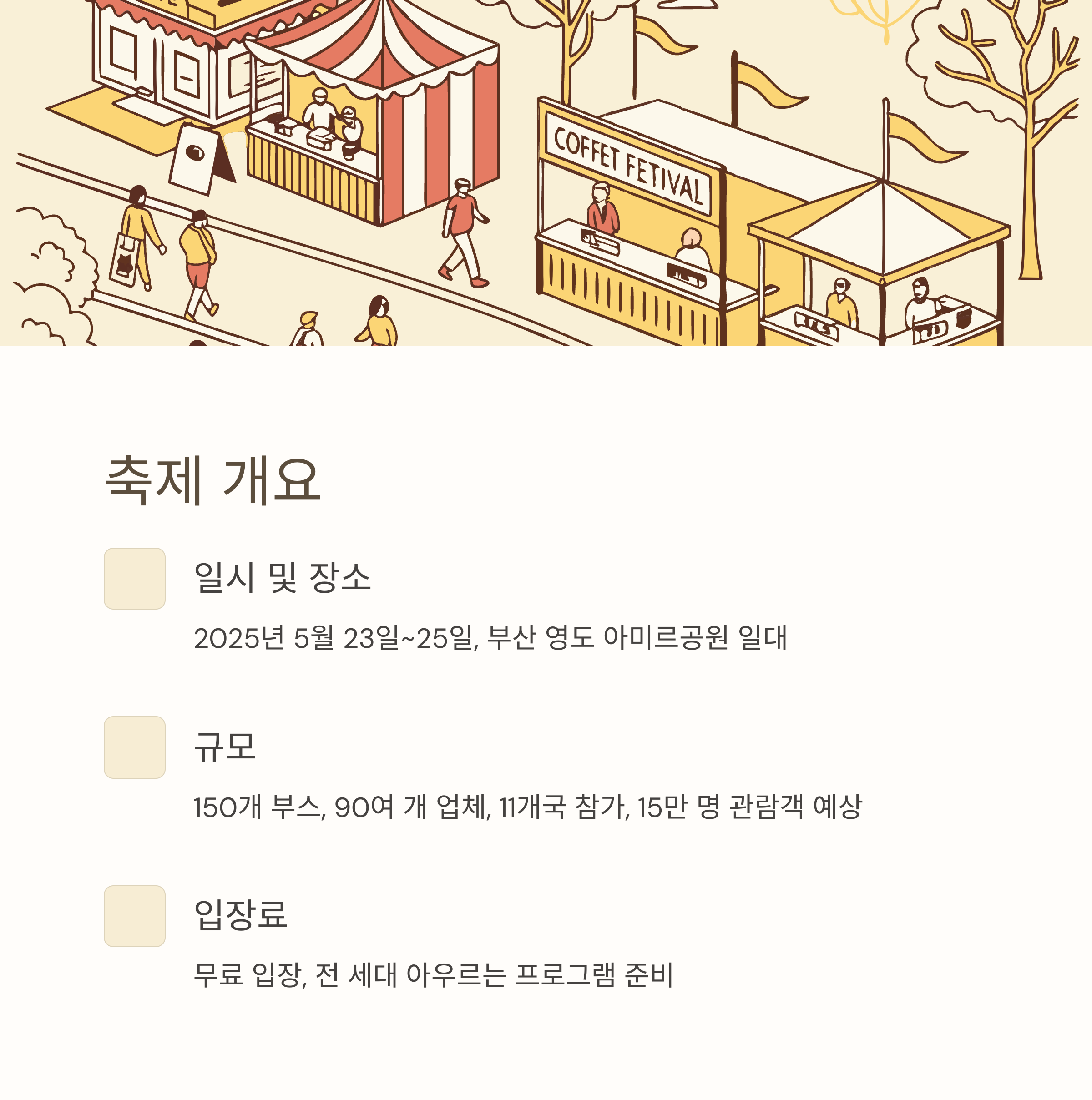 2025 글로벌 영도커피페스티벌은 5월 23일부터 25일까지 3일간, 부산 영도 아미르공원 일대에서 개최됩니다.