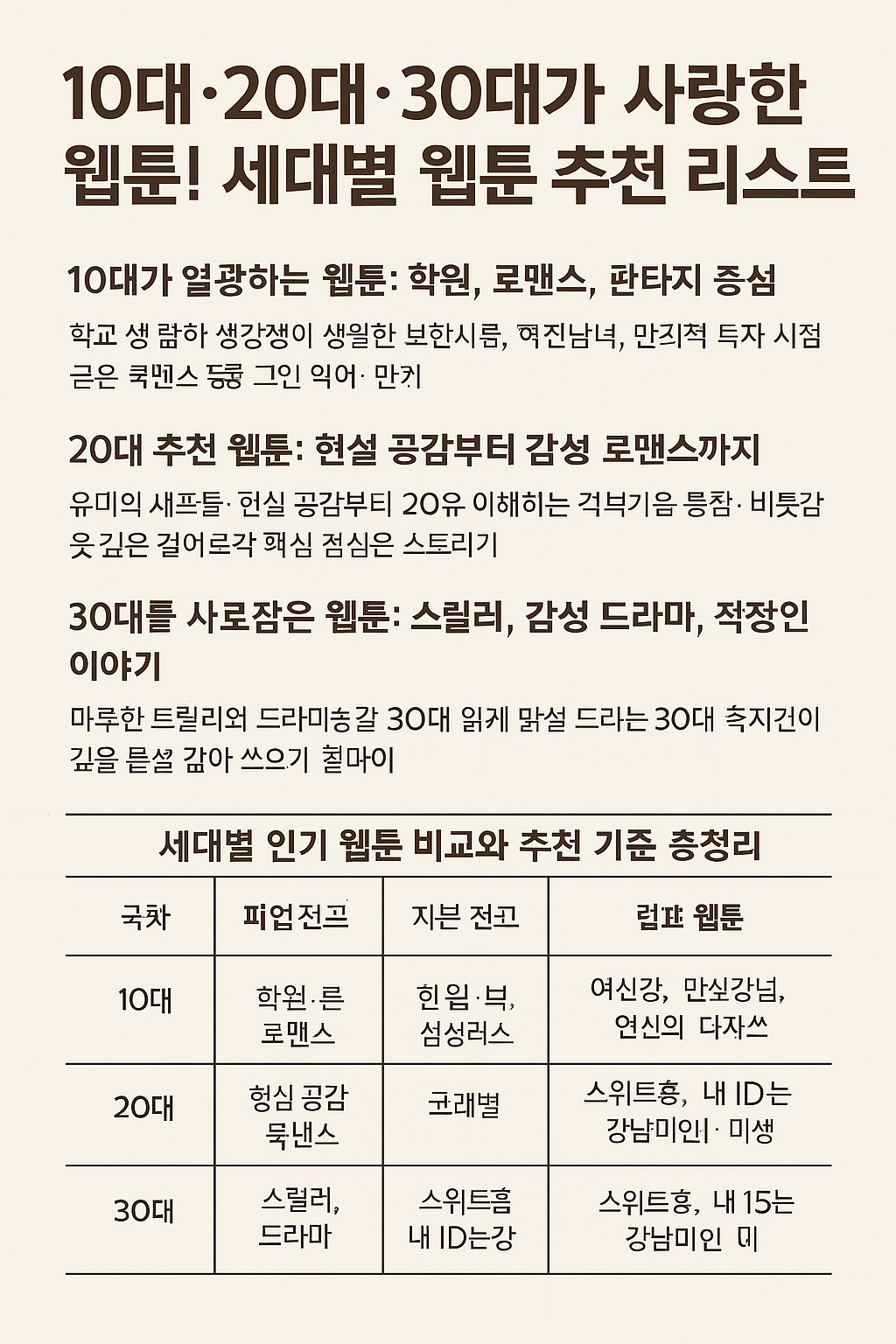 ✅ 마무리 요약 웹툰은 나이와 상관없이 누구나 즐길 수 있는 콘텐츠지만, 세대별로 공감하는 지점은 분명히 다릅니다. 10대에겐 비주얼과 친구 이야기, 20대에겐 감성적인 로맨스와 청춘의 고민, 30대에겐 인생과 사회를 담은 진중한 이야기가 더 깊게 와닿습니다. 이 글이 여러분이 좋아할 만한 웹툰을 찾는 데 조금이나마 도움이 되길 바랍니다.