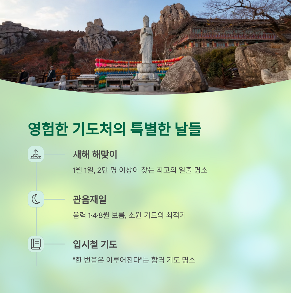 특히 입시철과 새해에는 수만 명이 모여드는 만큼, 한 번쯤은 꼭 들러야 할 기도처로 평가받고 있습니다.
