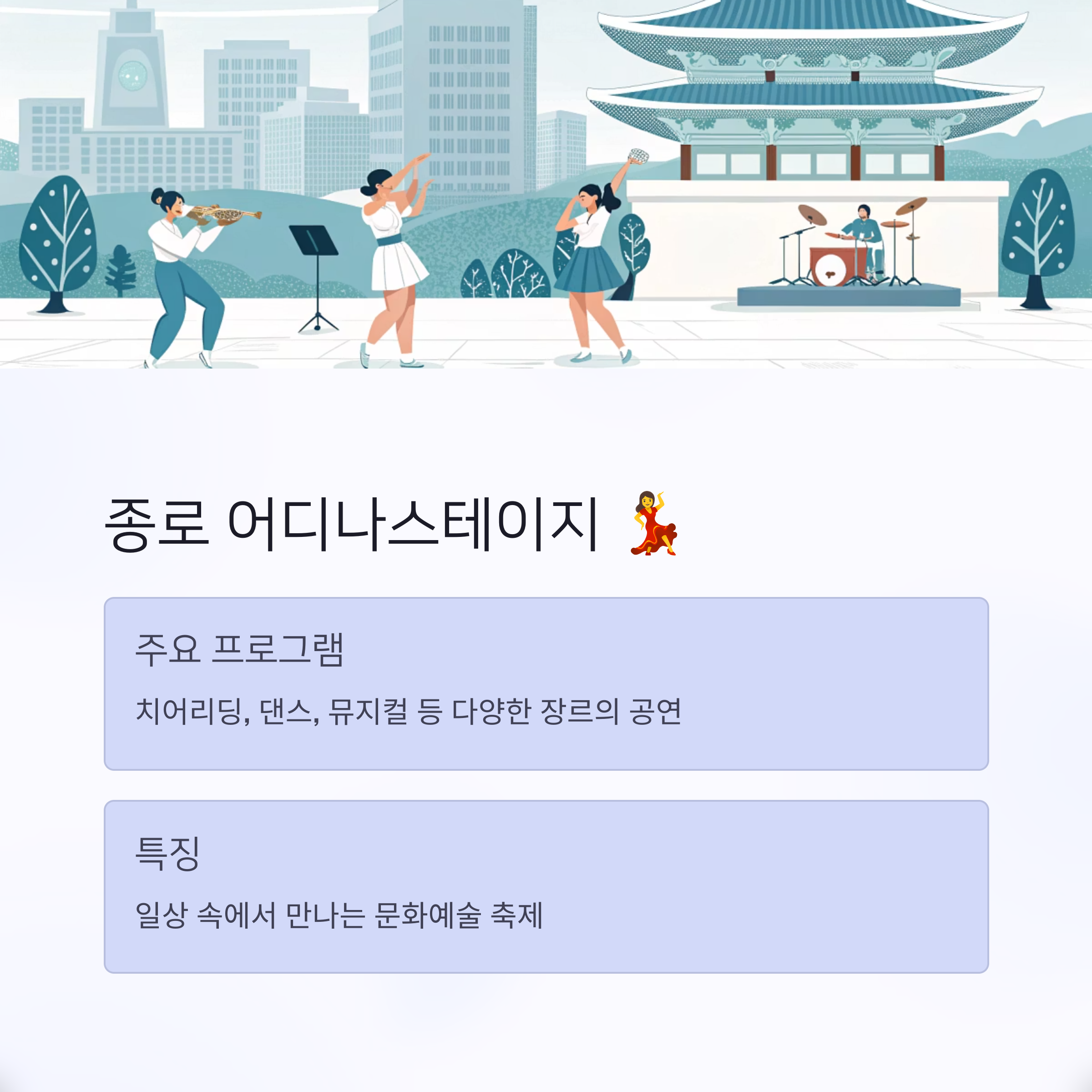 종로 곳곳에서 펼쳐지며, 일상 속 문화예술을 경험할 수 있어요.
