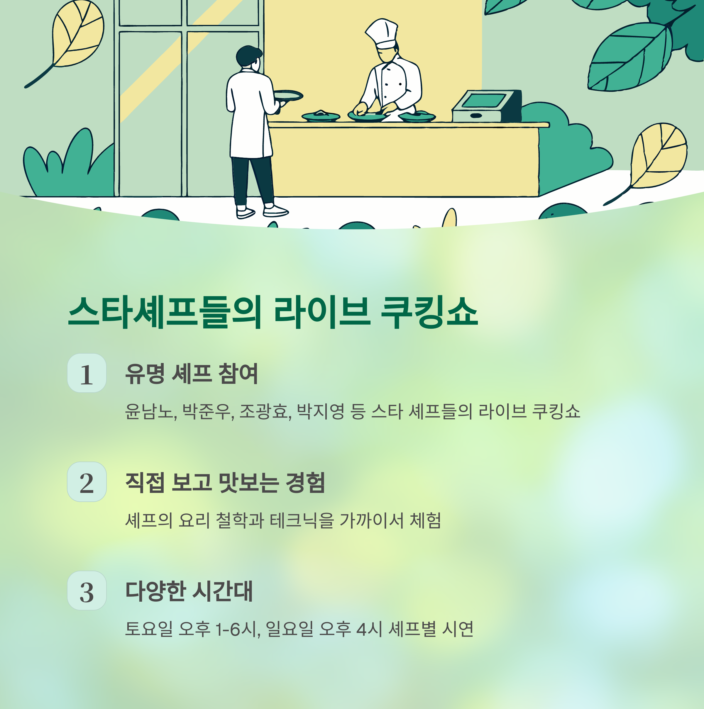 윤남노, 박준우, 조광효, 박지영 등 방송과 미디어에서 활약하는 스타 셰프들이 라이브 쿠킹쇼를 진행합니다.