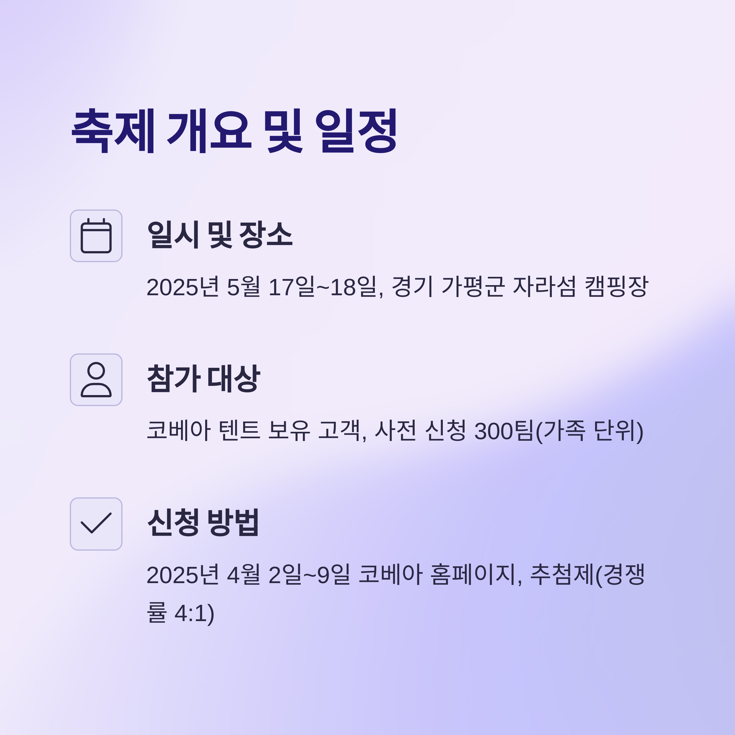 - 참가 대상: 코베아 텐트 보유 고객(코베아 회원), 사전 신청자 300팀(가족 단위)