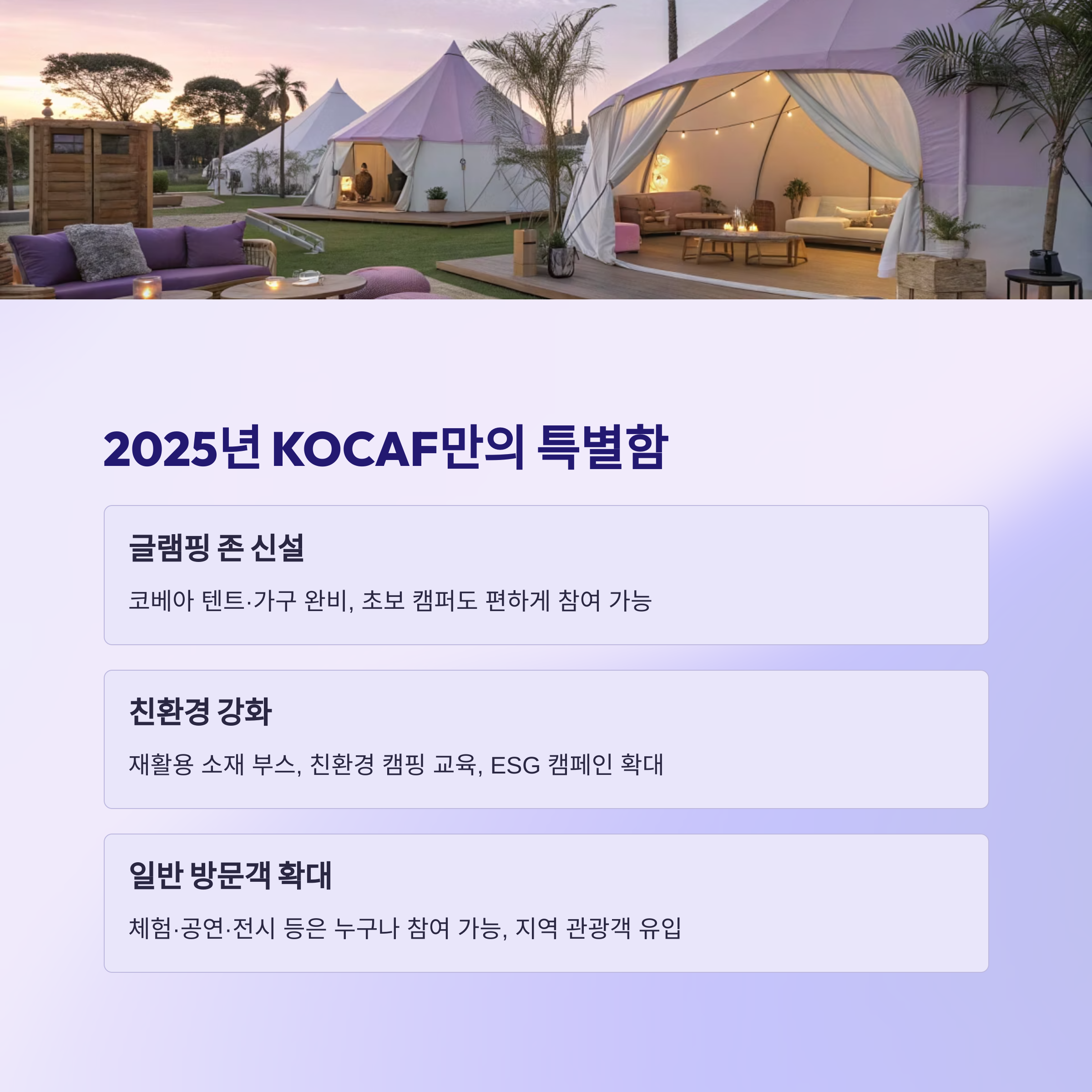 - “텐트·장비가 없어도 글램핑존에서 감성 캠핑 가능”