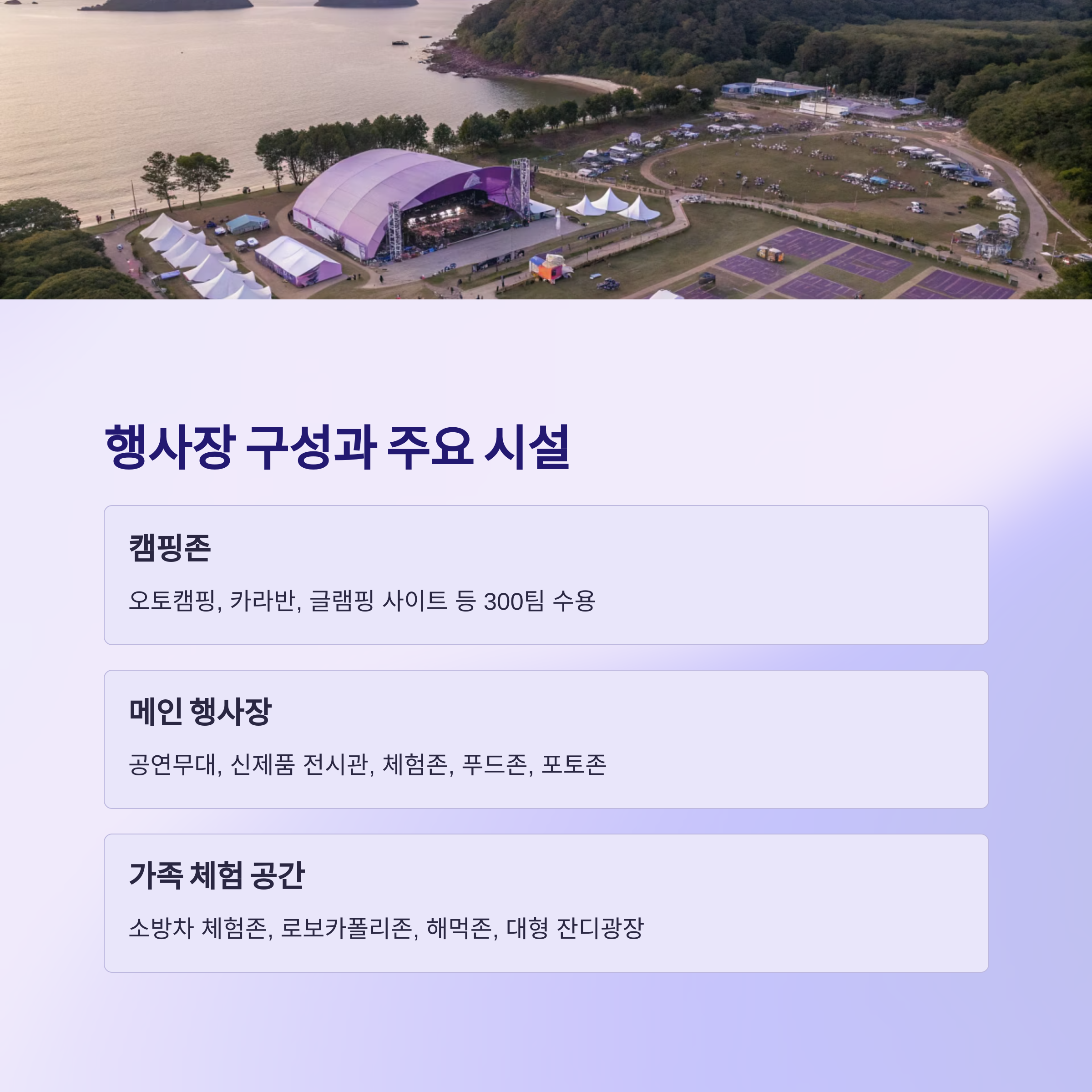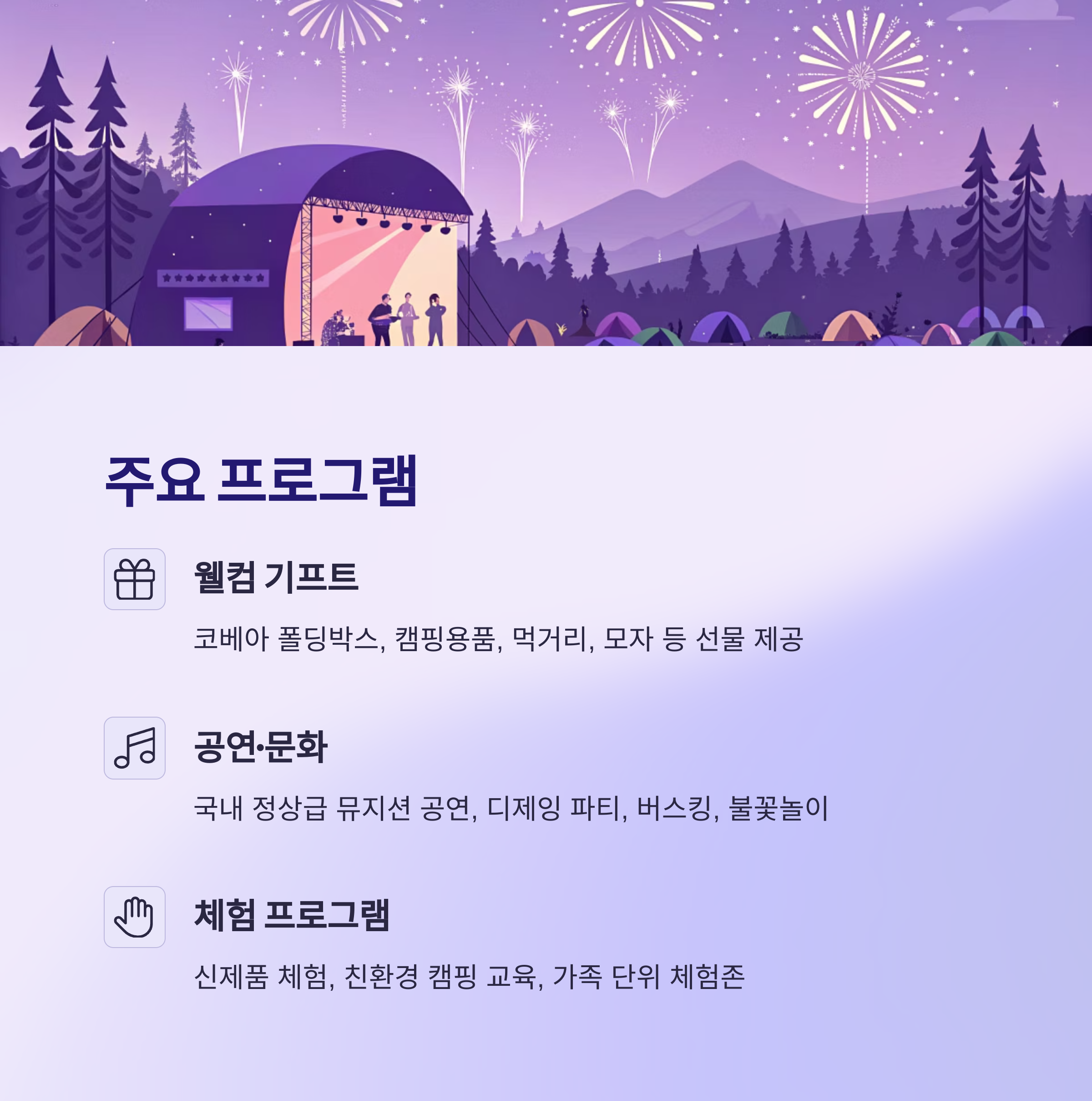 - 일반 방문객 확대: 캠핑존 외 체험·공연·전시 등은 누구나 참여 가능, 지역주민·관광객 유입 확대23